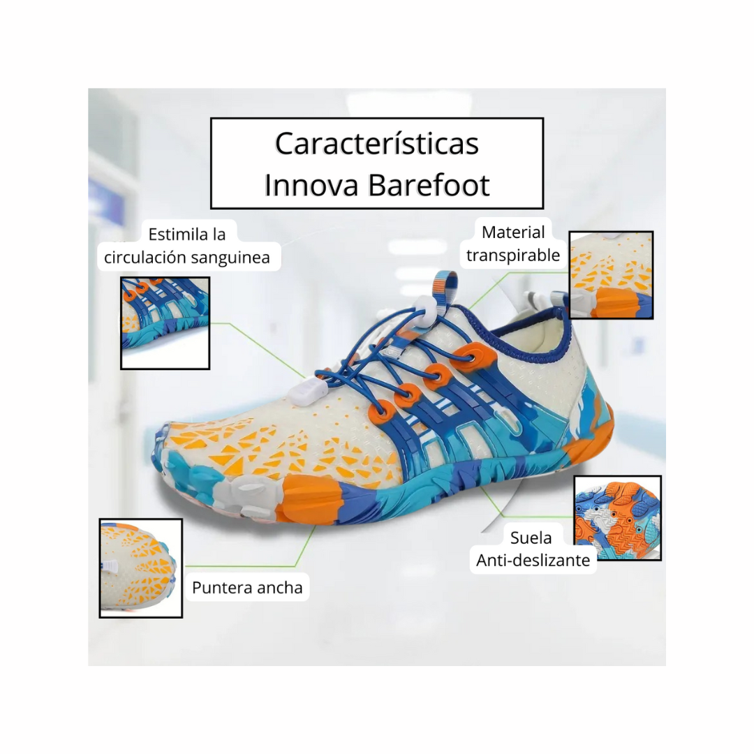 - Innova Barefoot respeta la anatomía del pie, mejora la alineación y previene dolores en rodillas, caderas, espalda y pies.