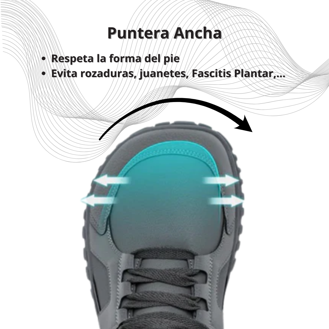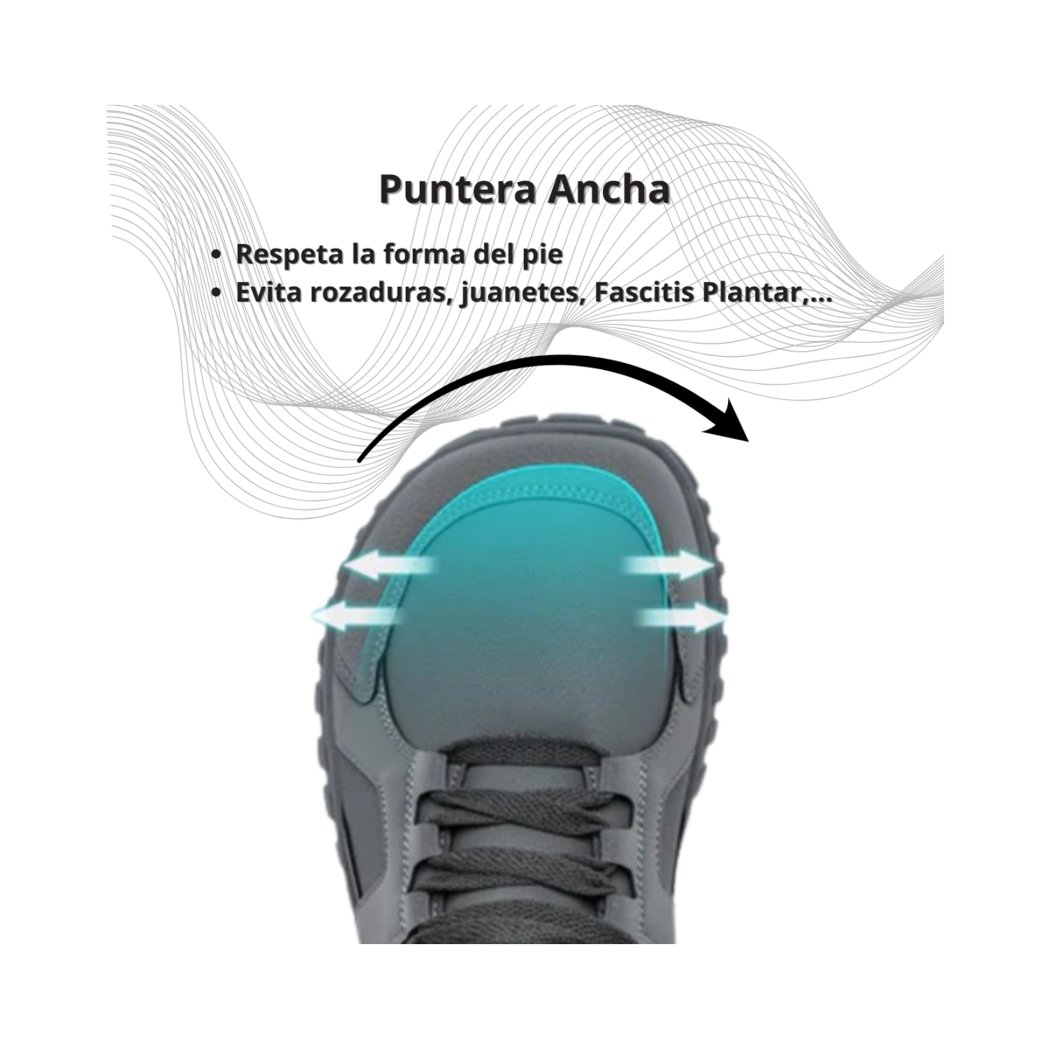 Su diseño ofrece un espacio amplio en la puntera que respeta la forma natural del pie, permitiendo que los dedos se muevan libremente para mayor bienestar, mejorando el equilibrio y la salud postural del tu pie y tu espalda.