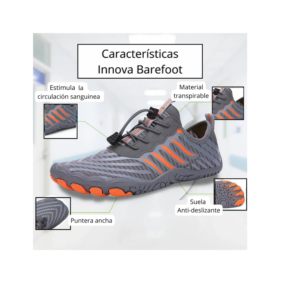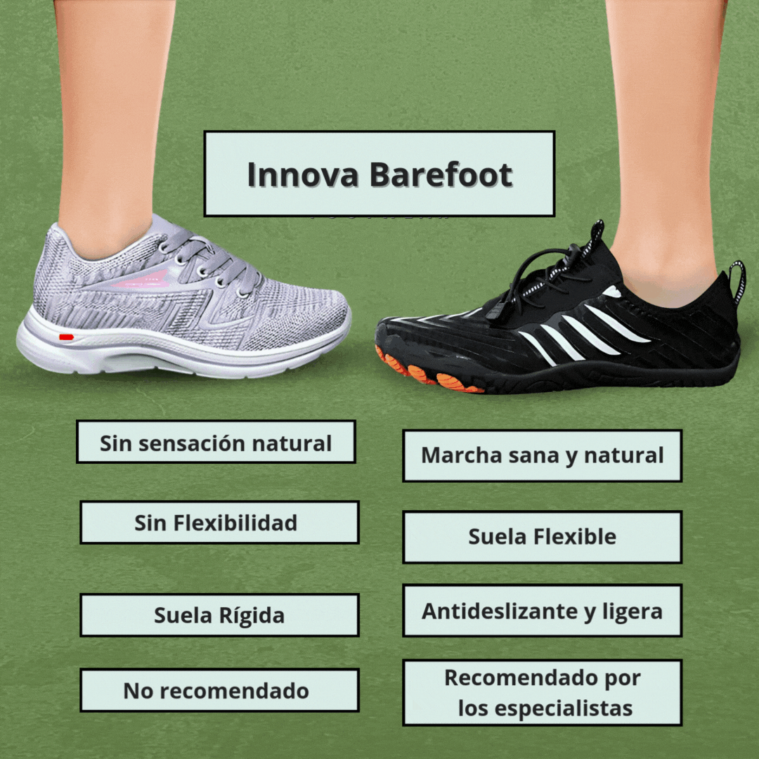 - Innova Barefoot respeta la anatomía del pie, mejora la alineación y previene dolores en rodillas, caderas, espalda y pies.